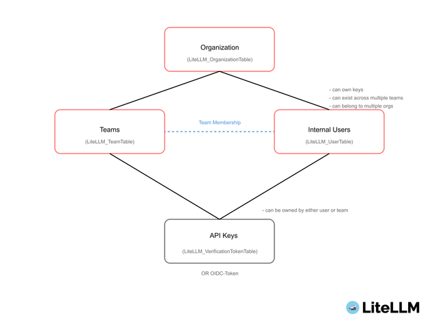 LiteLLM supports a hierarchy of users, teams, organizations, and budgets.